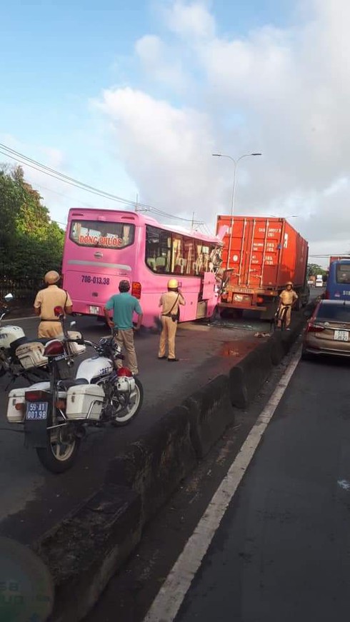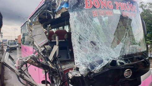 Ít phút sau đó, một chiếc xe khách của nhà xe Đồng Phước mang BKS: 70B - 013.38 chạy cùng chiều (hướng từ An Sương đi Tây Ninh) bất ngờ tông mạnh vào đuôi xe container đang dừng tại đây.
