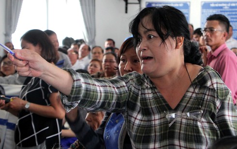 Một người dân tại Thủ Thiêm thể hiện bức xúc trước việc lãnh đạo quận 2 không có mặt trong buổi tiếp xúc cử tri sau kỳ họp HĐND thành phố vào cuối tháng 7/2018. |