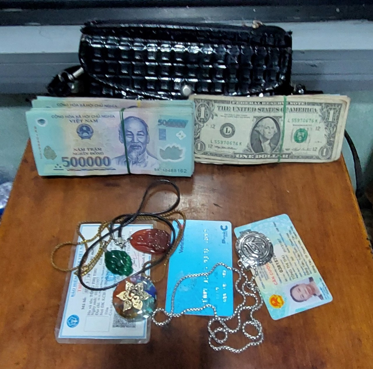 Tiếp viên đã báo cáo sự việc, trưởng tàu cùng với bảo vệ trực tiếp xuống tại toa số 5 tiến hành kiểm tra phát hiện trong túi có các giấy tờ tuỳ thân. Ngoài ra, trong túi còn có 72,3 đồng, 3 USD Mỹ, 1 dây chuyền màu vàng gắn mặt đá, 1 dây chuyền màu trắng gắn mặt màu trắng, 1 dây chuyền gắn mặt màu nâu, 1 hạt đá màu xanh.