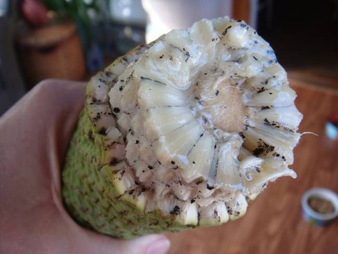 Nếu quả chín, ăn phần thịt bên trong sẽ có vị như kết hợp của chuối, dứa và xoài. |