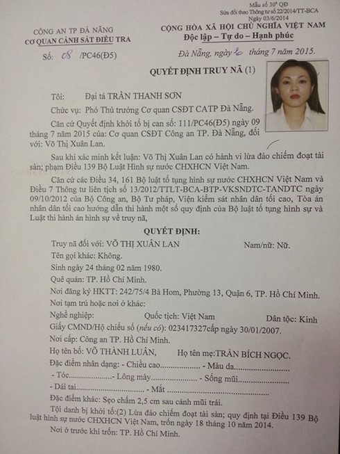 Lệnh truy nã đặc biệt trên toàn quốc của CATP.Đà Nẵng đối với Võ Thị Xuân Lan |