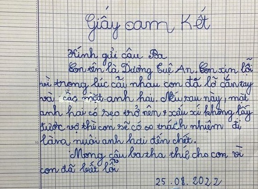 “Nếu sau này mặt anh hai có sẹo trở nên xấu xí không lấy được vợ thì con sẽ có trách nhiệm đi làm nuôi anh hai đến chết", bé gái thật thà viết.