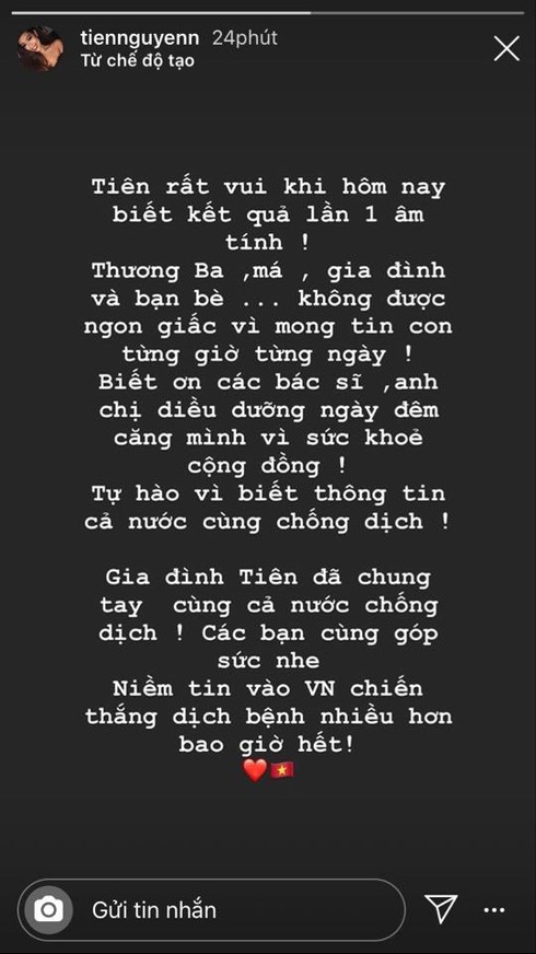 Sau khoảng 10 ngày điều trị tại TP.HCM, vào ngày 18/3, Tiên Nguyễn thông báo các kết quả xét nghiệm cho âm tính với Covid-19.