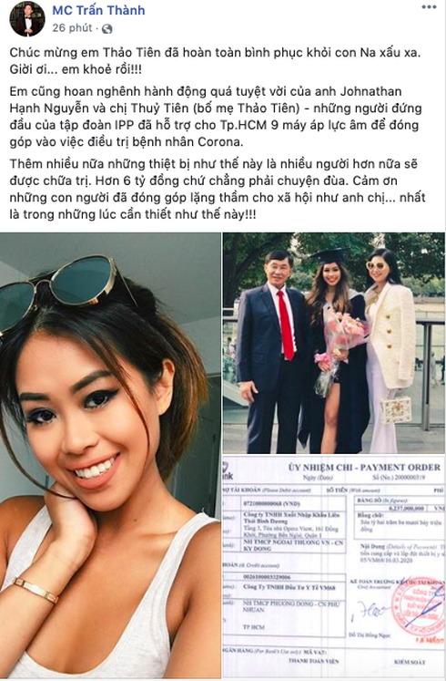 Cùng với đó, MC Trấn Thành hoan nghênh hành động tuyệt vời của ông Johnathan Hạnh Nguyễn và bà Thủy Tiên (bố mẹ của Tiên Nguyễn) đã hỗ trợ cho TP.HCM 9 phòng cách ly áp lực âm, đóng góp vào công tác phòng chống và điều trị bệnh nhân nhiễm Covid-19.