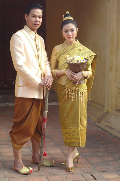 Cô dâu chú rể Lào mặc trang phục truyền thống Sinh và Salong màu vàng trong này cưới |