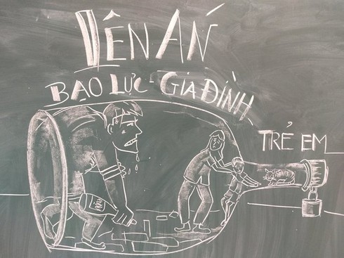 Những bức tranh được vẽ bằng phấn trắng trên nền bảng đen với nhiều chủ đề khác nhau: đua xe, đánh nhau, xả rác bừa bãi, hút thuốc lá, bạo lực gia đình. |