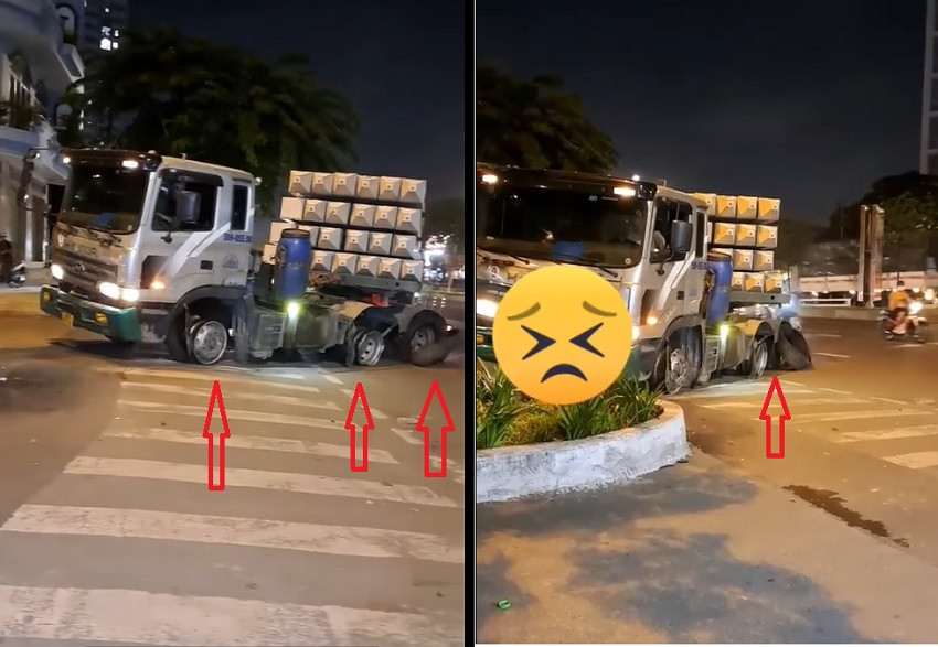 "Đi bằng vành như thế này rất nguy hiểm, xe chở hàng nặng dễ bị rơi lật hàng ra đường. Tốt nhất nên dừng xe, bật cảnh báo và chờ cứu hộ tới";