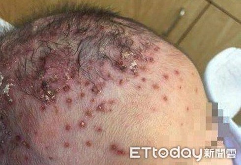 Đau lòng hơn nữa là con của anh Long cũng bị nhiễm bệnh, đầu phủ đầy những vết sần đỏ, khóc không ngừng do lây bệnh từ người cha thông qua ôm hôn hay tiếp xúc.