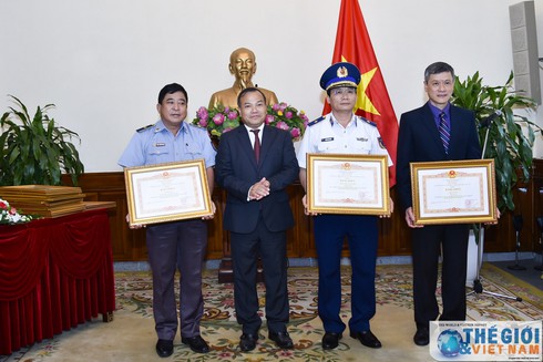 Thứ trưởng Vũ Hồng Nam trao Bằng khen của Thủ tướng Chính phủ cho các tập thể gồm: Bộ Tư lệnh Cảnh sát Biển, Bộ Quốc phòng; Cục Lãnh sự, Bộ Ngoại giao; Cục Kiểm ngư, Bộ Nông nghiệp và Phát triển Nông thôn và Đại sứ quán Việt Nam tại Indonesia đã có đóng góp tích cực và thành tích xuất sắc tiêu biểu trong công tác bảo hộ công dân và pháp nhân Việt Nam ở nước ngoài thời gian qua. Nguồn: Ảnh: TG & VN |