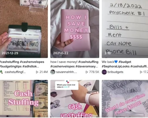 Các video có hashtag #cashstuffing (tạm dịch: nhồi nhét tiền) đã có hơn 571 triệu lượt xem trên nền tảng video ngắn TikTok. Tài khoản AbundantGains chia sẻ video nội dung về tiết kiệm tiền chi tiêu hàng tháng với phương pháp 'cashstuffing' đã thu hút hơn 11, 3 triệu lượt xem.