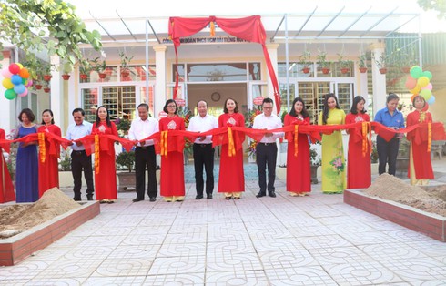 Các đại biểu cắt băng khánh thành Thư viện xanh và Tủ sách Đinh Hữu Dư tại Trường Trung học cơ sở Đức Thành (Nghệ An). (Ảnh: PV/Vietnam+) |