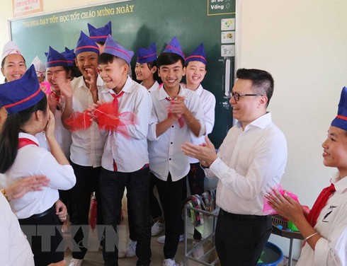 Phó Tổng giám đốc TTXVN Lê Quốc Minh với học sinh Trường Trung học cơ sở Đức Thành. (Ảnh: Nguyễn Oanh/TTXVN) |