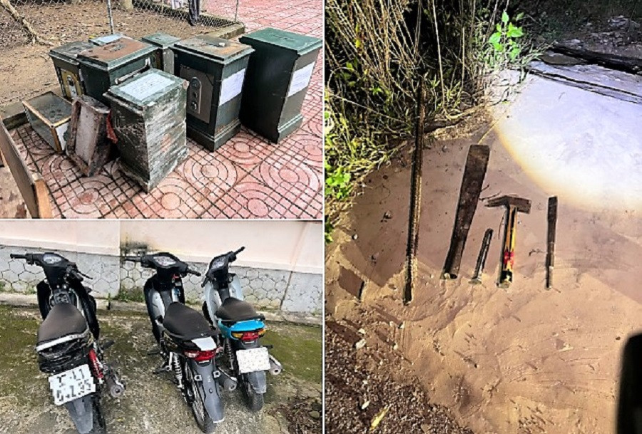 Tang vật thu giữ: 10 két sắt, 08 điện thoại di động, 03 xe mô tô, 02 kìm cắt sắt, 02 xà bạy, 02 búa đinh, 01 dao nhọn, hơn 30 triệu đồng tiền mặt và các vật chứng, tài liệu liên quan.
