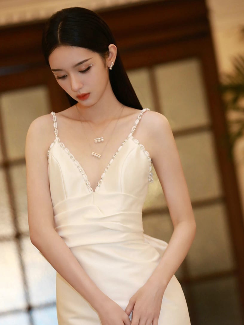Chiếc váy Triệu Lộ Tư mặc nhìn đơn giản nhưng có thể thể hiện sự tinh tế và cổ điển. Thiết kế cổ chữ U lớn có thể tôn lên vẻ mảnh mai của người mặc; những nếp xếp nếp tự nhiên phản ánh cảm giác sang trọng của Satin và tôn lên những đường cong thanh lịch.