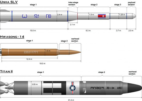 Kích cỡ của tên lửa Unha, Hwasong-14 của Triều Tiên và tên lửa Titan III của Mỹ. |