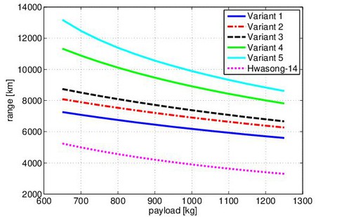 Các nhà nghiên cứu đã cùng nhau nghiên cứu và đưa ra 5 mô hình tên lửa hai tầng khác nhau chạy trên chương trình giả lập, tất cả đều có tầng một giống với Unha. Mô hình 1 có tầng 2 mang động cơ được lắp đặt trên tên lửa R-17 (tương tự với Unha), mô hình 2 có tầng hai mang động cơ thường thấy ở tên lửa Nodong của Triều Tiên. Mô hình 3,4 và 5 sẽ mang các động cơ lần lượt dành cho tên lửa Hwasong-10 (Musudan), R-27 và Hwasong-12. Hình bên dưới là biểu đồ cho thấy tầm bắn của từng mô hình sau khi được chạy giả lập.