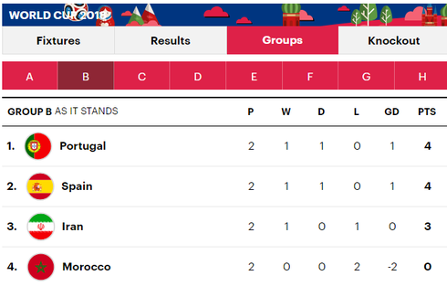 Cục diện bảng B, nơi có sự hiện diện của Bồ Đào Nha và Ma Rốc. |