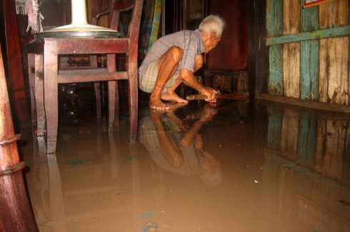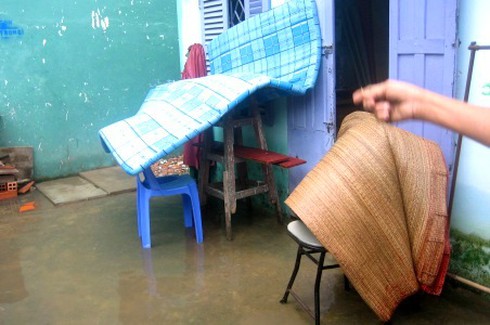 Sau cơn mưa rạng sáng ngày 3/10 căn nhà anh Bé bị ngập tới gần nửa mét nước, nhiều đồ vật trong nhà như giường, tủ, bàn ghế dù đã kê cao hơn nhưng vẫn không thoát nạn. Cho tới trưa nay, anh cùng hai cụ già vẫn đang hì hục múc từng xô nước đổ ra ngoài bờ bao.