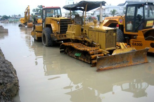 Nhiều mày móc đang thi công tuyền đường Tân Sơn Nhất - Bình Lợi - Vành đai ngoài cũng bị nước "bao vây"