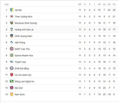 Bảng xếp hạng trước vòng 12 V.League 2018: