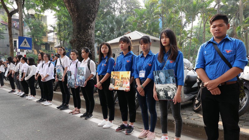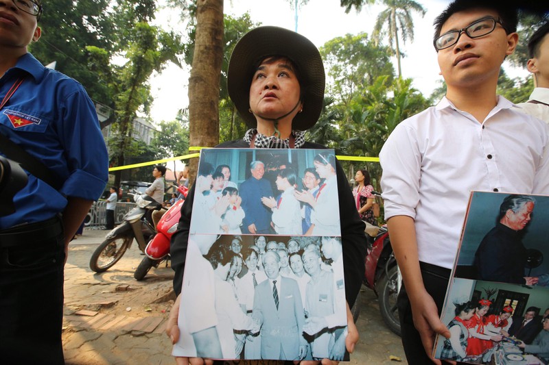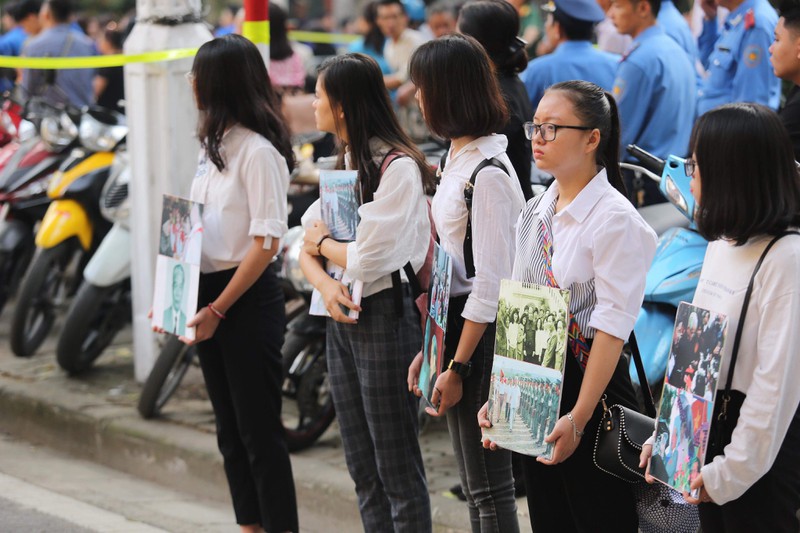 Dọc hai bên đường cổng Nhà Tang lễ, nhiều người dân, thanh niên và học sinh đứng chờ để tiễn đưa cố Tổng Bí thư Đỗ Mười. |