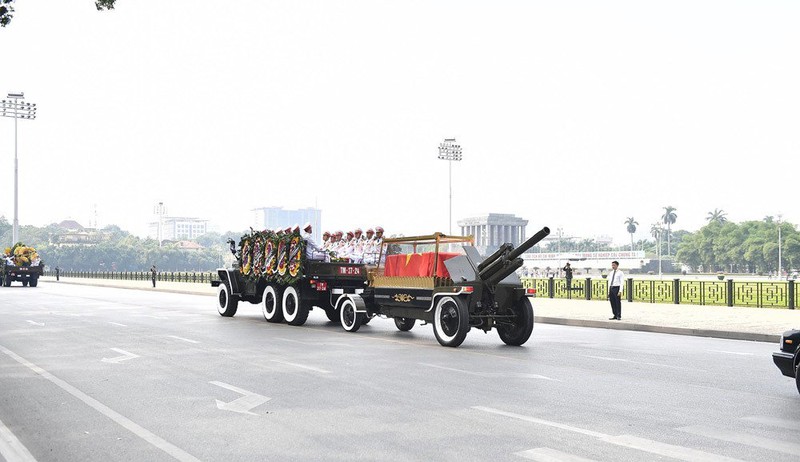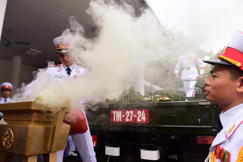 Đoàn linh xa đưa linh cữu nguyên Tổng bí thư Đỗ Mười chầm chậm rời khỏi Nhà tang lễ Quốc gia. Các lãnh đạo, nguyên lãnh đạo Đảng, Nhà nước cũng đi theo cỗ linh xa để tiễn biệt.