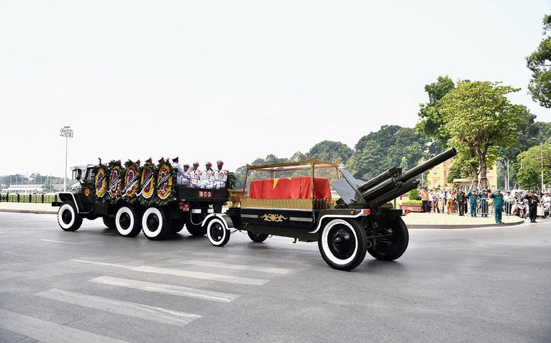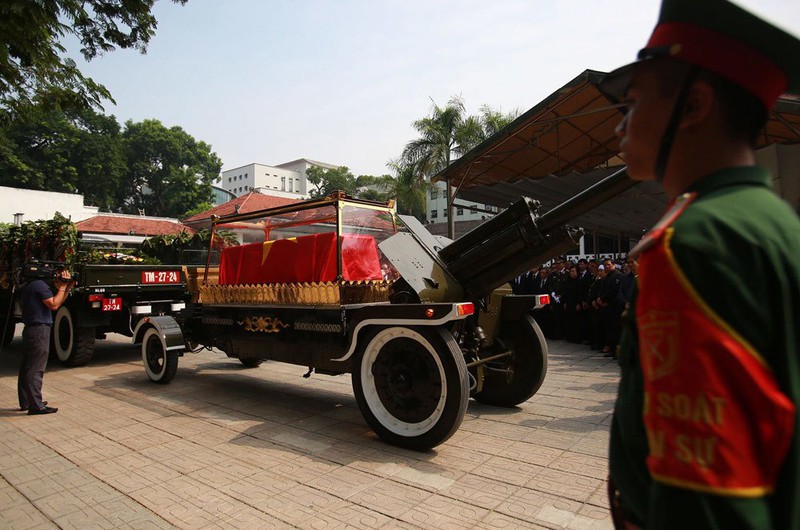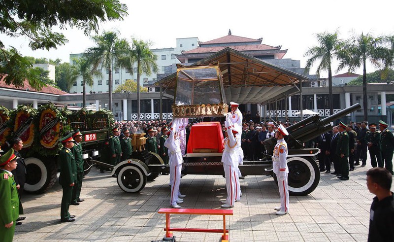 Linh cữu của nguyên Tổng Bí thư Đỗ Mười được đặt lên cỗ linh xa. Đội nghi lễ phủ lá Quốc kỳ và lồng kính được các tiêu binh đặt lên linh cữu.