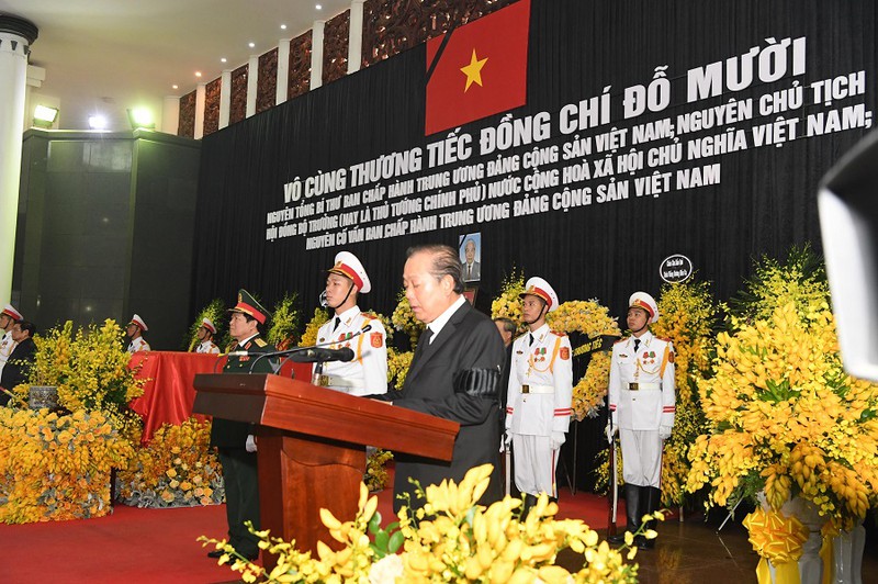 Tổng Bí thư Nguyễn Phú Trọng, Trưởng ban Lễ tang đọc lời điếu tại lễ truy điệu nguyên Tổng bí thư Đỗ Mười. |