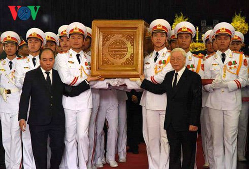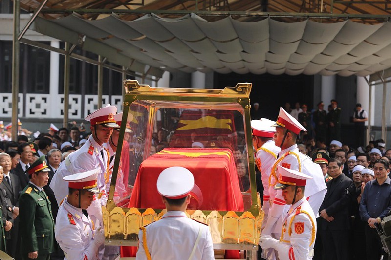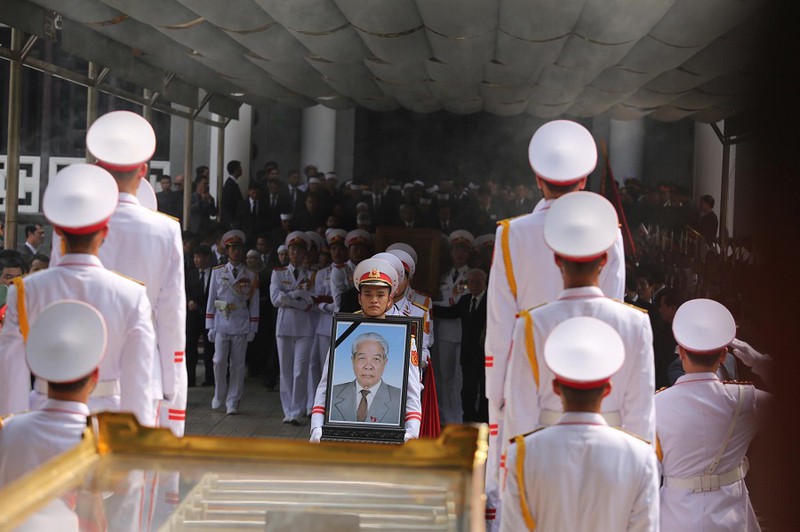 Linh cữu nguyên Tổng Bí thư Đỗ Mười được di chuyển ra ngoài đài lễ. Tổng Bí thư Nguyễn Phú Trọng và Thủ tướng Nguyễn Xuân Phúc đứng hai bên cùng nâng linh cữu nguyên Tổng Bí thư Đỗ Mười di chuyển ra cỗ linh xa.
