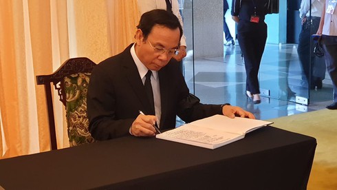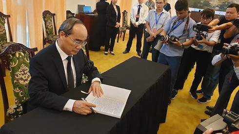 Bí thư Thành ủy TP.HCM Nguyễn Thiện Nhân viết sổ tang...Ảnh: Nguyễn Cường |