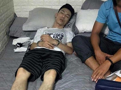 Nguyễn Viết Huy, tự “nấm độc”, bị còng tay trên giường ngủ. (Ảnh: P.NAM/ báo Pháp luật TP.HCM) |