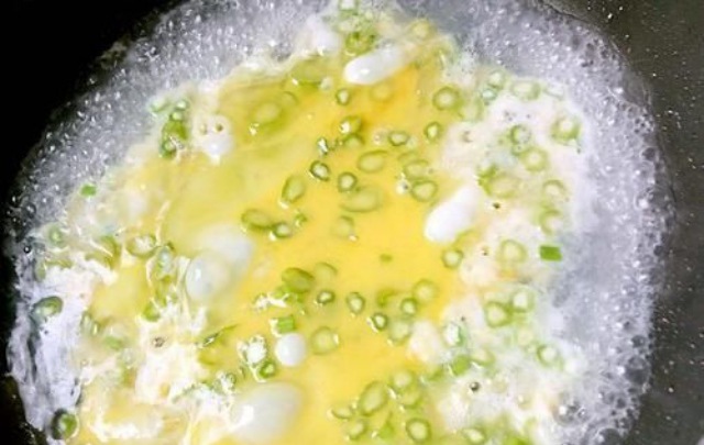 Bước thứ hai, đổ nửa bát con nước vào nồi đun sôi, sau khi đun sôi thì đổ dung dịch trứng vào. Lưu ý, lúc này không đảo ngay trứng mà đợi sau khi trứng gần đông lại hết thì rắc hành lá thái nhỏ vào, lúc này mới bắt đầu đảo trứng.