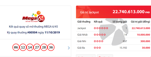 Tại kỳ quay số mở thưởng thứ 504 loại hình xổ số Mega 6/45 diễn ra tối 11/10, Công ty Xổ số điện toán Việt Nam (Vietlott) đã tìm ra được chiếc vé của người chơi may mắn có các số trùng khớp với giải Jackpot, trị giá 22.740.613.000 đồng.