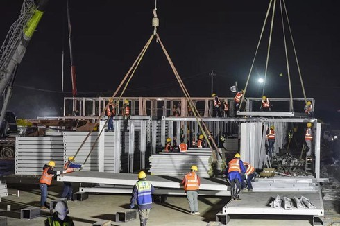 Các công nhân viên làm việc ngày đêm tại công trường xây dựng bệnh viện dã chiến Hỏa Thần Sơn tại Vũ Hán. Ảnh: AP |