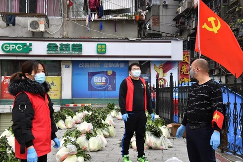 Các tình nguyện viên đeo khẩu trang đứng cạnh số rau củ được chuyển tới phân phát cho một khu dân cư bị cách ly ở Vũ Hán. Ảnh: Reuters |