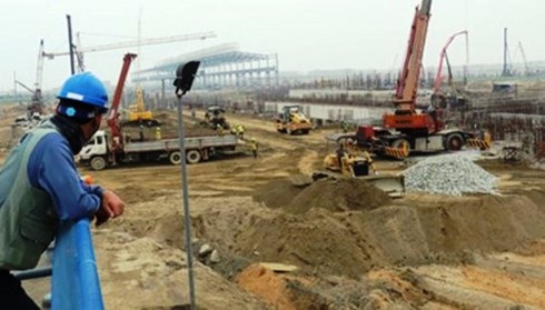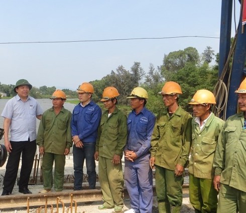 Ông Nguyễn Văn Thanh, chủ tịch Liên đoàn lao động tỉnh Hà Tĩnh (bên trái, ngoài cùng) thăm công nhân tại một công trường thi công tại tỉnh |