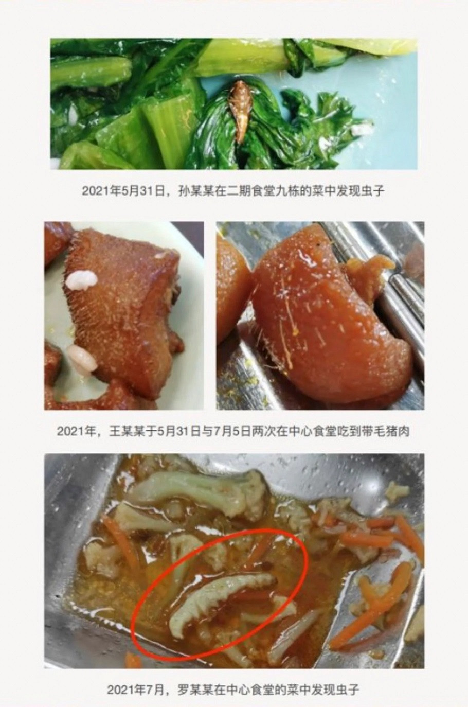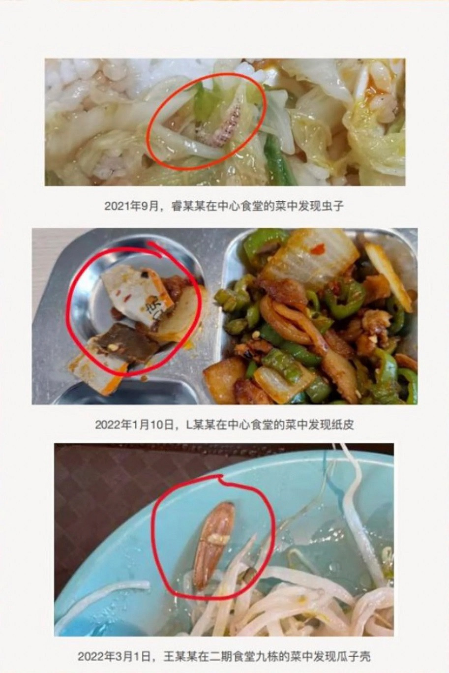 Như hồi tháng 10/2020, một sinh viên họ Luo phát hiện có dây sắt trong món thịt. Một sinh viên khác họ Sun nhận thấy đồ ăn đã bị thiu thối.