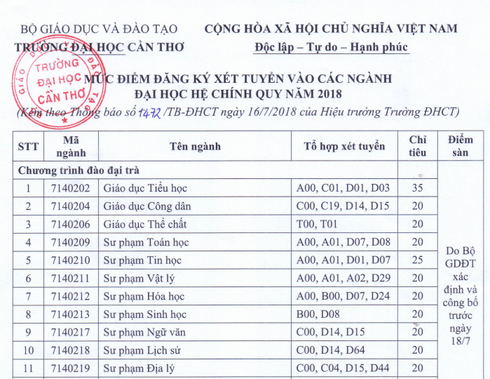 Mức điểm đăng ký xét tuyển (còn gọi là điểm sàn) được xác định theo ngành và không phân biệt tổ hợp xét tuyển theo danh mục ngành đính kèm. Đối với các ngành đào tạo giáo viên, điểm sàn do bộ Giáo dục và Đào tạo xác định và công bố trước ngày 18/7/2018 (Trường ĐHCT sẽ cập nhật sau).