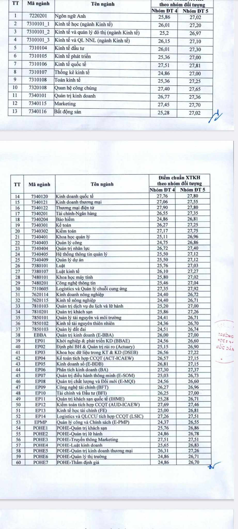Trường ĐH Kinh tế Quốc dân công bố điểm chuẩn theo phương thức xét tuyển kết hợp với nhóm đối tượng 4 và 5. Trong đó, nhóm đối tượng 4 là những thí sinh có chứng chỉ tiếng Anh quốc tế kết hợp với điểm thi tốt nghiệp THPT năm 2023.