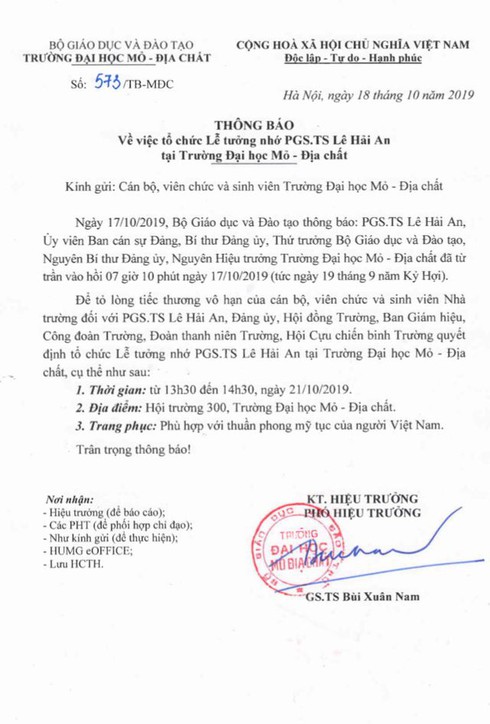 Thông báo của Trường ĐH Mỏ - Địa chất về việc tổ chức Lễ tưởng nhớ Thứ trưởng Lê Hải An. |