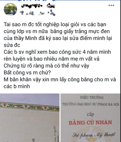Cụ thể, em N.V.H (cựu sinh viên khóa 63 khoa Nghệ thuật Trường ĐH Sư phạm Hà Nội) cho biết, suốt 2 năm đi tìm câu trả lời cho việc tại sao trong buổi lễ trao bằng tốt nghiệp em nhận được bằng giỏi nhưng sau đó giáo vụ khoa Nghệ thuật đã gọi em mang bảng điểm và bằng tốt nghiệp lên khoa và trả lại bằng khá.
