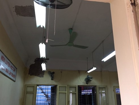 Chia sẻ với Zing.vn, ông Phan Thanh Tùng - Hiệu trưởng trường THPT Trần Nhân Tông - nói vữa trần nhà rơi xảy ra trong phòng học của lớp 10A12 và 12A13. Rất may trong hai lần đó, cả trường được nghỉ và học sinh đang ngoài sân tập thể dục nên không có tai nạn đáng tiếc.