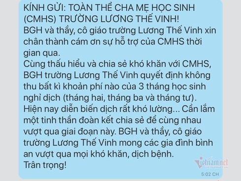 Mới đây toàn thể cha mẹ học sinh của Trường THCS và THPT Lương Thế Vinh bất ngờ nhận được tin nhắn từ nhà trường. Trong đó, Ban giám hiệu cho biết, để chia sẻ khó khăn với cha mẹ học sinh, nhà trường quyết định không thu bất kỳ khoản phí nào của 3 tháng phải nghỉ vì dịch Covid-19 (gồm tháng 2, 3, 4), bao gồm học phí, phí học trực tuyến...