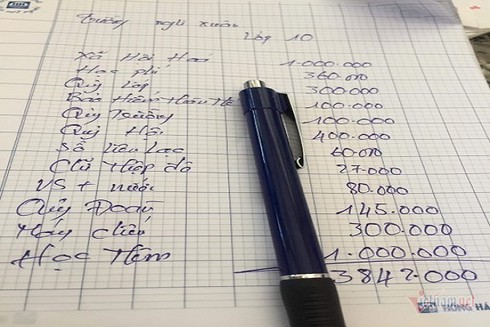 Một phụ huynh lớp 10 phản ánh họ đã phải đóng hơn 3,8 triệu đồng. Trong đó, xã hội hóa 1 triệu; học phí 360 ngàn; quỹ lớp 300 ngàn, bảo hiểm thân thể 100 ngàn; quỹ trường 100 ngàn; quỹ hội 400 ngàn; sổ liên lạc 60 ngàn; hội chữ thập đỏ 27 ngàn; giấy vệ sinh và nước 80 ngàn; quỹ đoàn 145 ngàn; máy chiếu 300 ngàn; học thêm 1 triệu đồng.