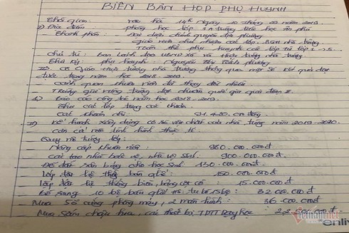 Cũng theo bà Thảo, năm nay UBND xã Ân Phú vận động xây dựng cơ sở vật chất của trường với kinh phí hơn 2 tỷ đồng. Trong biên bản họp phụ huynh ngày 10/9, có mục cải tạo nhà bảo vệ, nhà vệ sinh lên tới 900 triệu đồng, khoản này phụ huynh cho rằng quá cao so với thực tế.