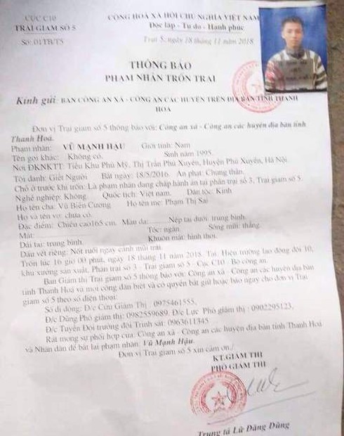 Theo thông báo này, Công an xã, Công an các huyện trên địa bàn tỉnh Thanh Hóa và người dân có quyền bắt giữ hoặc báo ngay cho đơn vị Trại giam số 5 để bắt lại phạm nhân.