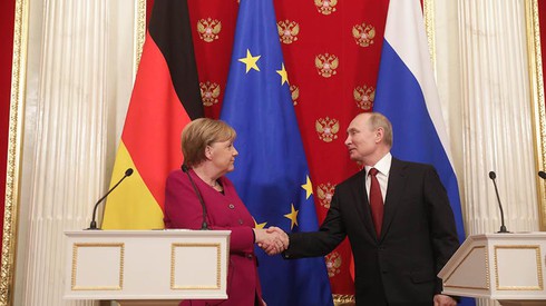 Thủ tướng Đức Angela Merkel hội đàm với Tổng thống Nga Vladimir Putin. Ảnh: Kremlin. |