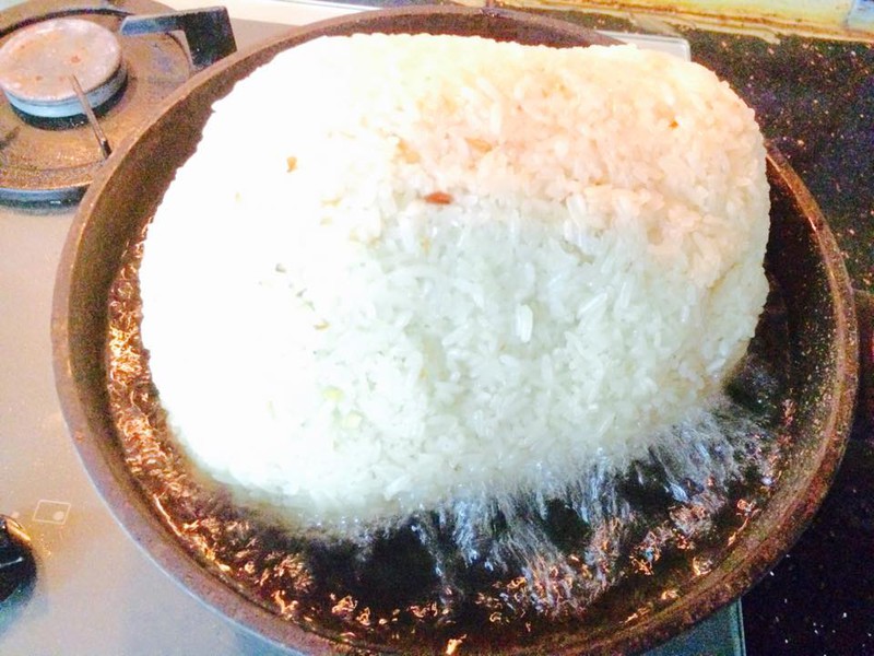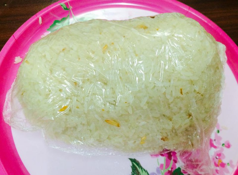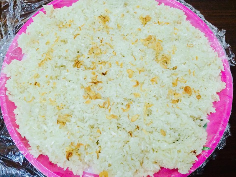 - Dùng 1 khay rộng, trải màng bọc thực phẩm ra kín khay. Xôi để hơi nguội thì dàn phẳng xuống mặt khay trên. Cho phần hành phi vàng trải đều trên mặt xôi.