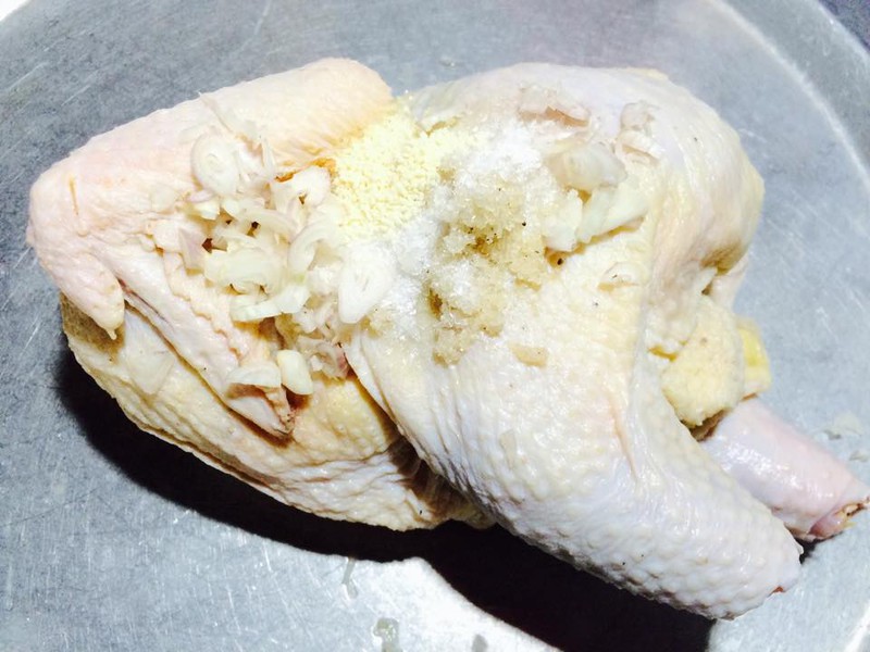 - Gà mổ moi, sơ chế và rửa sạch, để ráo, chặt bỏ bớt đầu và chân cho gọn. Xoa đều trên da gà và bụng gà với hỗn hợp bột canh, hạt nêm, hành khô băm nhỏ và một chút hạt tiêu. Để gà ngấm gia vị ít nhất 30 phút.