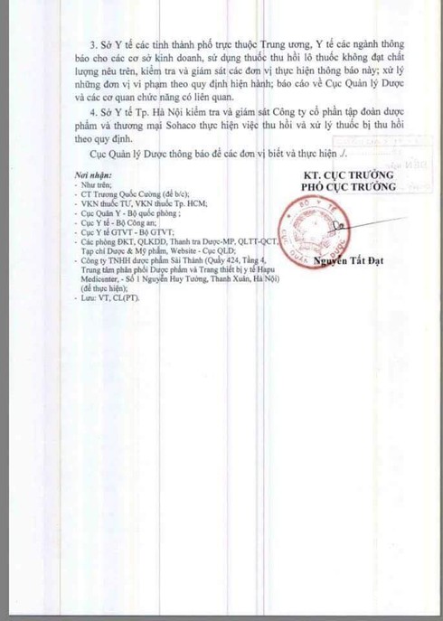 Công văn của Cục Quản lý Dược thông báo việc thu hồi thuốc kém chất lượng của Sohaco.